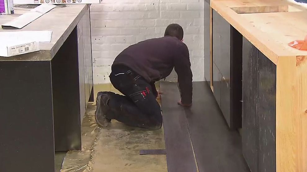 De eerste rij kan je al in elkaar klikken voor je deze op zijn plaats legt. Daarna kan deze onder de plint van de keukenkasten geschoven worden. Links van de kasten is er nog een insprong. Hier worden dus nog op maat gemaakte planken voorzien.