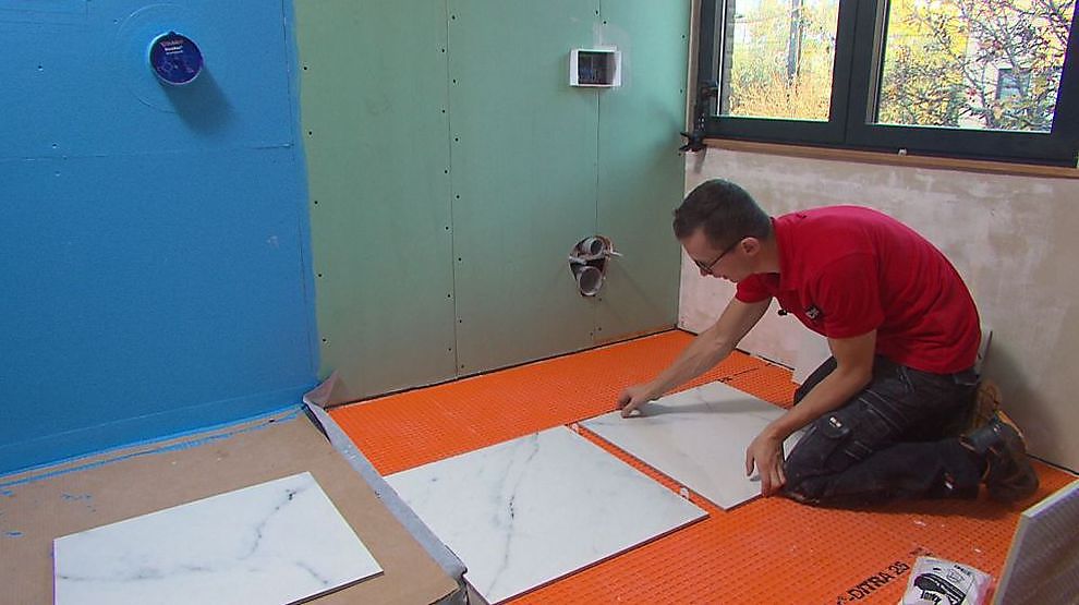 Roger - ep. 4 - Vloer Tegelen. De vloer en de muur in het natte gedeelte worden getegeld. We werken hier op een houten ondergrond, dus plaatsen we ook een ontkoppelingsmat.
