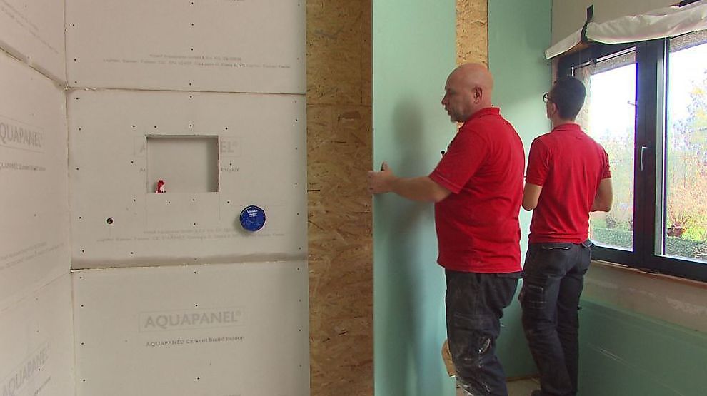 De wanden zijn nu volledig opgebouwd. In de volgende uitzending zie je hoe de douchebak wordt geplaatst, hoe de douche een waterdichte coating krijgt en hoe de naden van de muur verder worden afgewerkt.